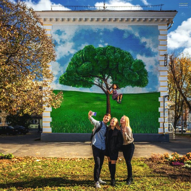 Being located not far from the central city square, the mural presents a girl swinging under a tree with the clear sky and the green field in background.