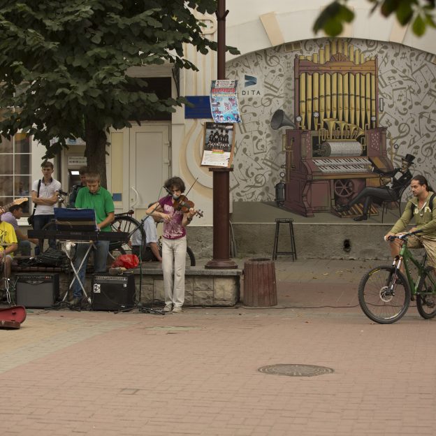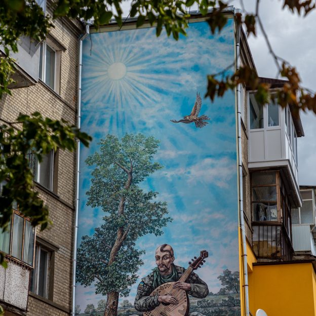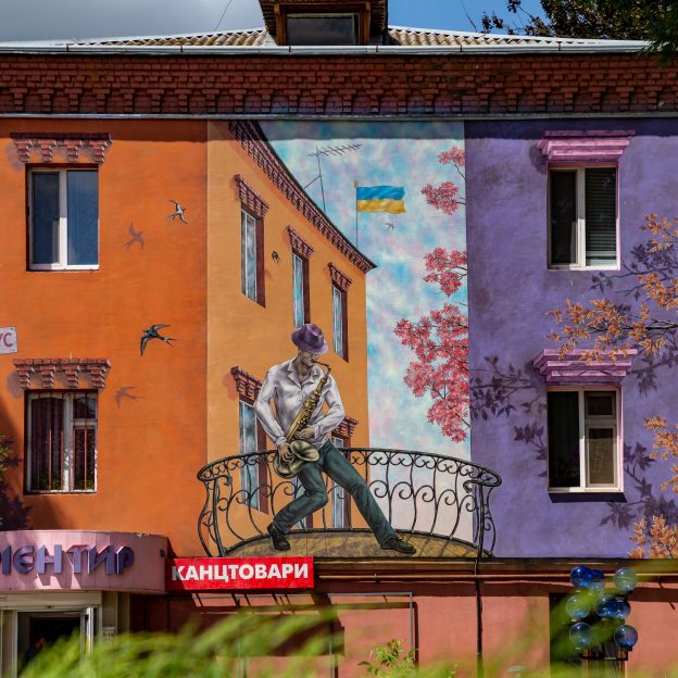 Near the Mykhailo Starytskyi Music and Drama Theatre, on the walls of a residential building, there is a dynamic picture: there on the autumn background a curious musician saxophonist is illustrated. The character looks pretty animated as if he plays a jazz melody.