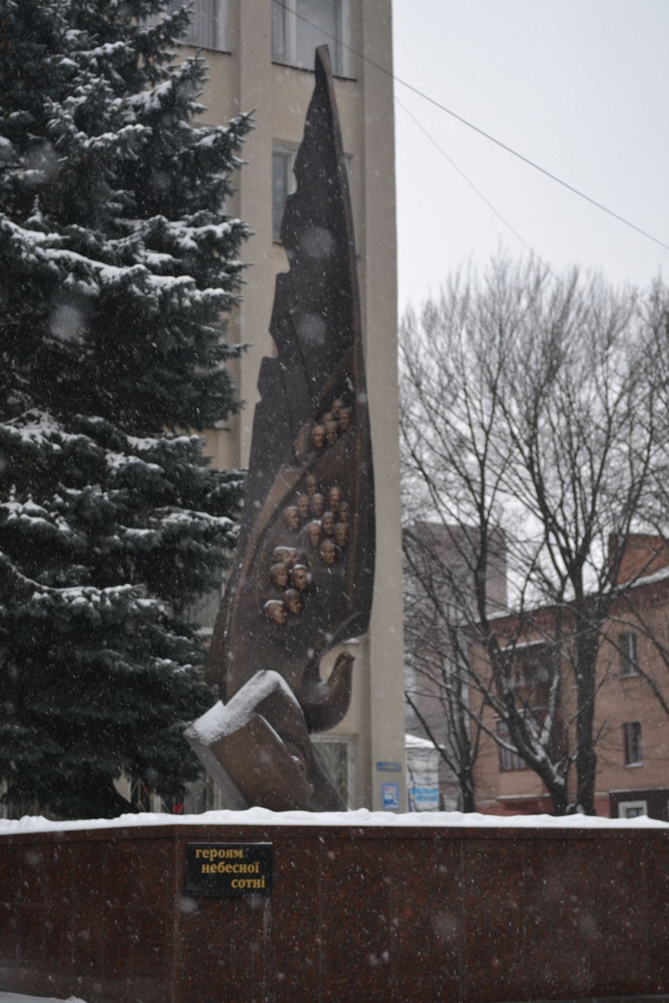 Pomnik z brązu przedstawiony jest jako gołąb stojący na odciętej głowie kruka, co symbolizuje zwycięstwo dobra nad złem. Na jego skrzydle wyryte są twarze zamordowanych podczas Rewolucji Godności. Na odwrotnej stronie rzeźby widnieje się napis: „Ukraina – ponad wszystko!”. Gołąb z brązu osiąga wysokość sześciu i pół metra. Autorami dzieła są znani malarze i rzeźbiarze z Chmielnickiego Roman Albuł i Mykoła Mazur.